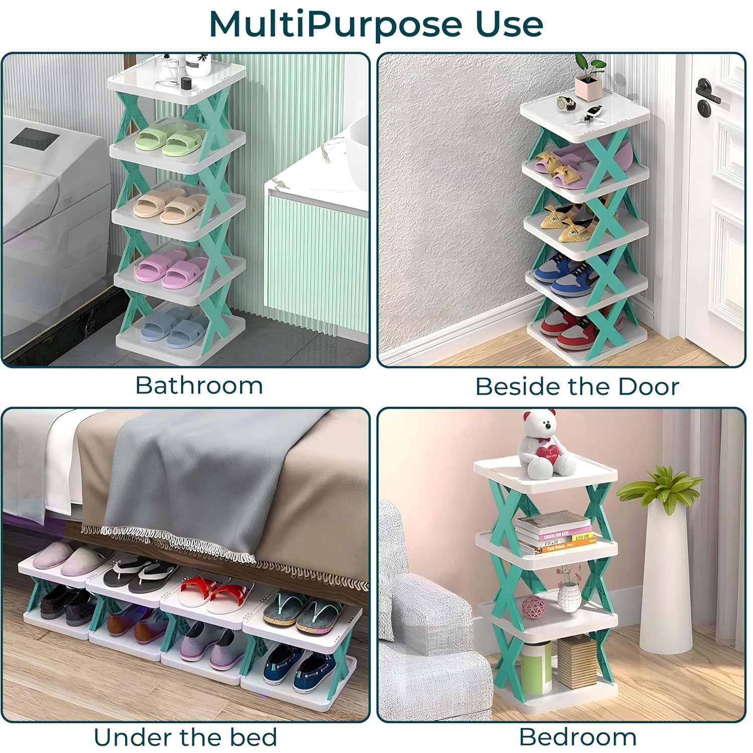 QONETIC 4 Layer Plastic Shoe Rack for Home Stackable & Adjustable Shoe Organizer Shelf for Entryway, Bedroom & Corner Use Space-Saving Foldable Stand with Book & Shoe Storage Slots (4-Layer)